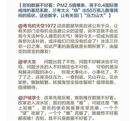 《人民日报》评论员认为:PM2.5值爆表,高于0.4国际警戒线的基尼系数,兰考大火“烧”出50万孤儿散落民间的现状,这些数字,让有关部门“压力山大”,数据背后的深层症结反映社会发展的短腿、生态文明的欠账、重点领域改革的滞后。不怕开始不好看,就怕始终很难看,如何攻坚克难才是关键一招。我部教师在讨论中认为: 改革先易后难,难就难在数据不好看。改革进入深水区,面对的就是“难”,可能是“难上加难”,官员的使命就是攻坚克难,一个个“坚”攻破了,一个个“难”克服了,数据项不好看都很难!否则,就不只是数据不好看了。