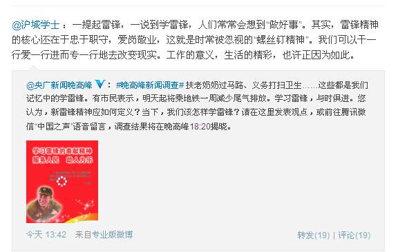 3月4日,《央广新闻晚高峰》新浪微博进行晚高峰新闻调查: 扶老奶奶过马路、义务打扫卫生……这些都是我们记忆中的学雷锋。有市民表示,明天起将乘地铁一周减少尾气排放。学习雷锋,与时俱进。您认为,新雷锋精神应如何定义?当下,我们该怎样学雷锋?我部教师“沪城学士”在评论中认为:一提起雷锋,一说到学雷锋,人们常常会想到“做好事”。其实,雷锋精神的核心还在于忠于职守,爱岗敬业,这就是时常被忽视的“螺丝钉精神”。我们可以干一行爱一行进而专一行地去改变现实。工作的意义,生活的精彩,也许正因为如此。