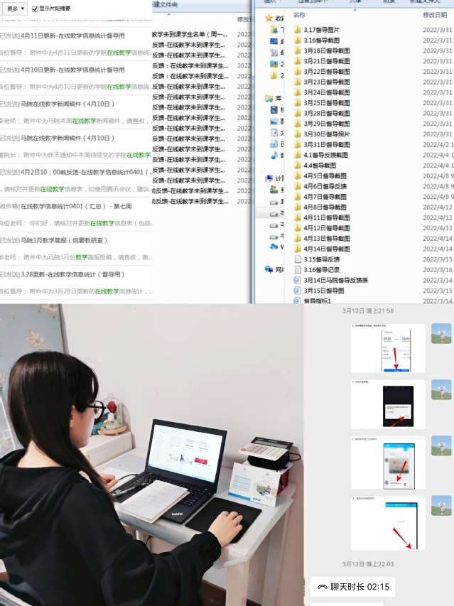 3月12日,王琳参加公司在线教学压力测试后,立刻梳理思想政治理论课在线教学中可能存在的软硬件问题,并制定了详细应对策略。为了让任课教师更快了解熟悉直播教学平台、泛雅教学平台的线上课程建设与使用方法等,她通过微信、电话等方式,耐心对老师的咨询进行一对一培训和答疑。在线教学期间,她时刻关注公司疫情防控的通知要求,认真对待每一项任务,及时统计反馈公司每日课程的在线教学情况、员工到课情况等,做好师生间沟通的桥梁,与任课教师们并肩作战,共“课”时艰。为规范线上教学秩序,确保线上教学质量,她保证授课时间一直online,并进入在线课堂开展巡课听课,了解教学过程中的师生动态,时刻处在“备战”状态,做到了第一时间解决师生遇到的各种问题与困难,努力为思想政治理论课教学做好基础保障工作。