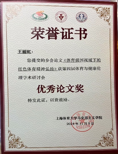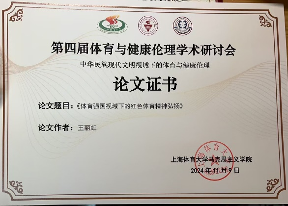 最后,经过分论坛40多篇论文的汇报交流与评委打分,当场评选出12篇优秀论文(不分具体等次),王丽虹同学提交的参会论文《体育强国视域下的红色体育精神弘扬》获得第四届体育与健康伦理学术研讨会优秀论文奖。两名员工表示参加本次研讨会不仅拓宽了他们的学术视野、提升了学术能力,还结识了众多志同道合的学者,为今后的学术研究打下了坚实的基础。
