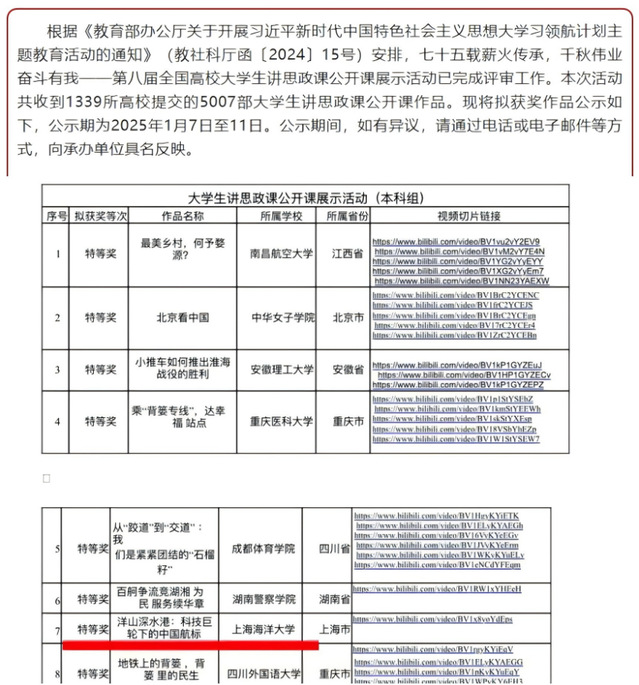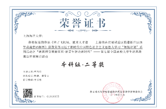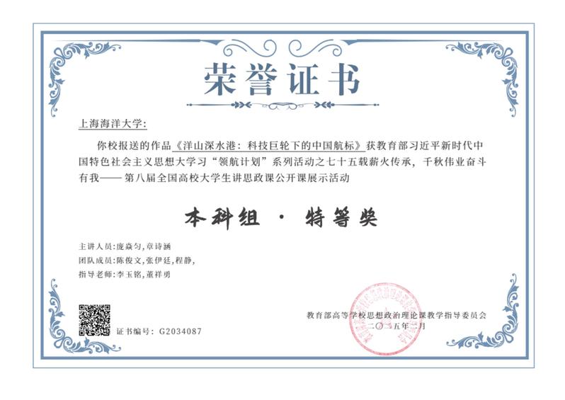 2025年1月7日,由教育部高校思想政治理论课教学指导委员会主办、南开大学yl23455永利承办的“七十五载薪火传承,千秋伟业奋斗有我——第八届全国高校老员工讲思政课公开课展示活动”评审结果公示,由yl23455永利李玉铭、董祥勇老师指导,陈俊文、张伊廷、程静、章诗涵、庞焱匀等同学共同创作的思政公开课《洋山深水港:科技巨轮下的中国航标》,在1339所高校提交的5007部参赛作品中获特等奖。